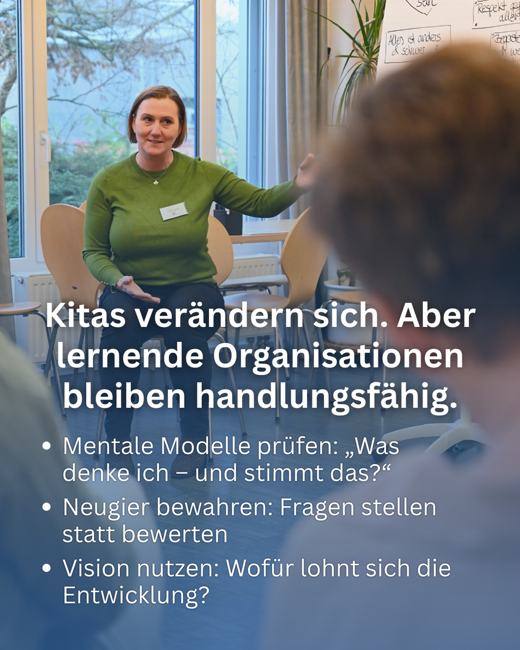 Mit einem Impuls zur „Lernenden Organisation“ zeigte VEK-Fachberaterin Johanna Nolte, wie Teams durch Reflexion, Neugier und überprüfte mentale Modelle ihre Entwicklungsfähigkeit bewahren können. In Zeiten großer Veränderungsdynamik ist das ein zentraler Baustein, um als Einrichtung steuerungsfähig zu bleiben. Vertiefende Workshops und der kollegiale Austausch rundeten das Programm ab.