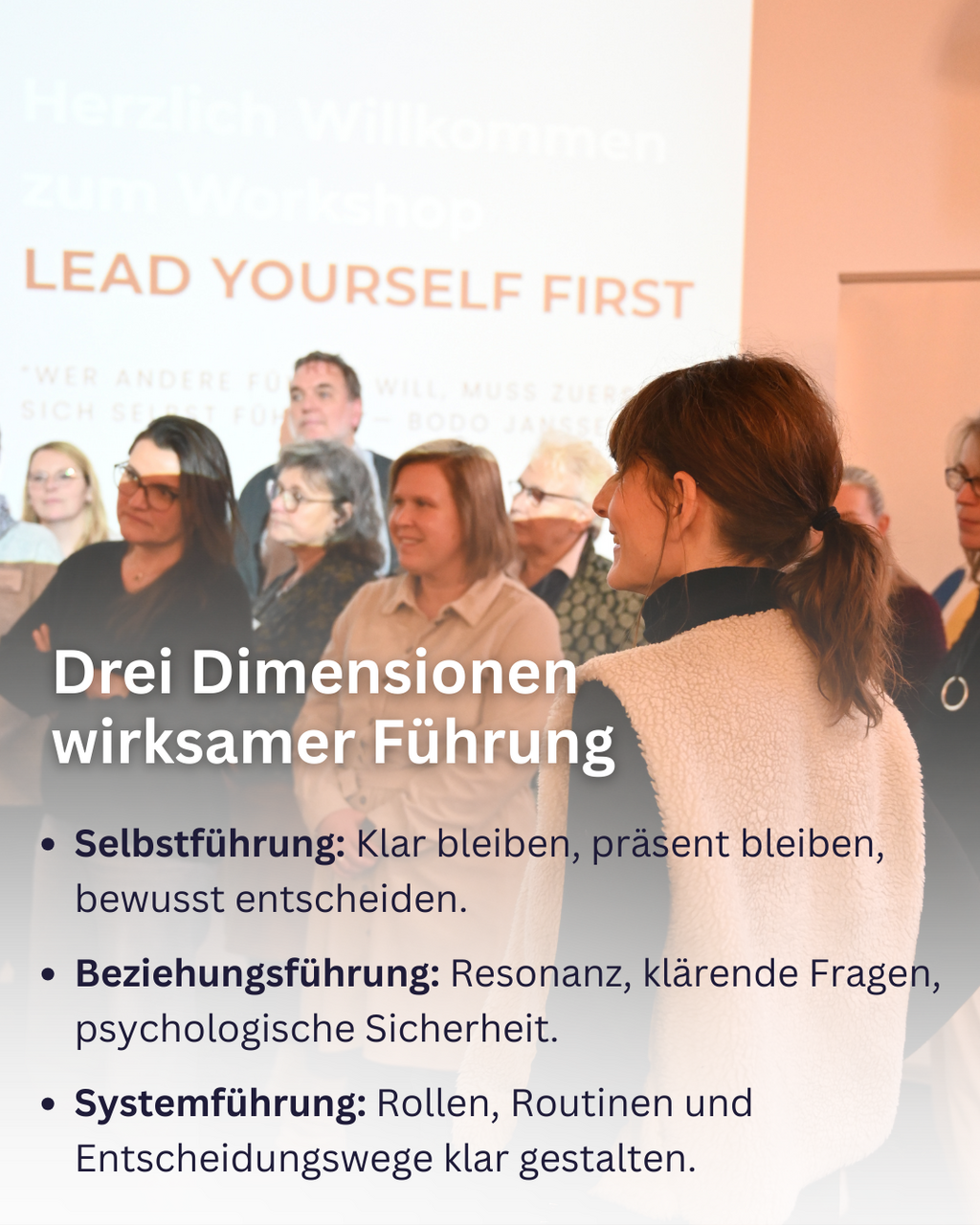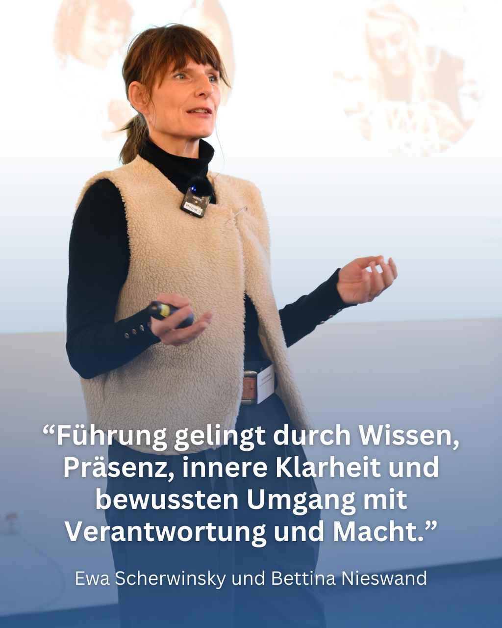 Die Hauptreferentinnen Bettina Nieswand (Betriebs- und Organisationspsychologin) und Ewa Scherwinsky (Coach für Transformationsprozesse) machten in ihrem Impuls deutlich, dass moderne Führung weit über organisatorische Aufgaben hinausgeht. Führung beginnt im Nervensystem, so ihre zentrale These: „Innere Klarheit, bewusste Selbstregulation und Präsenz sind Voraussetzungen dafür, in Stresssituationen handlungsfähig zu bleiben.“